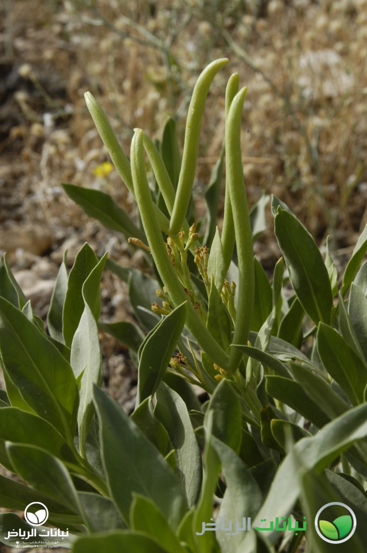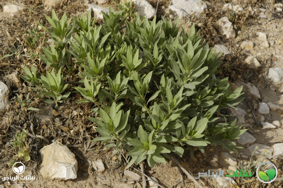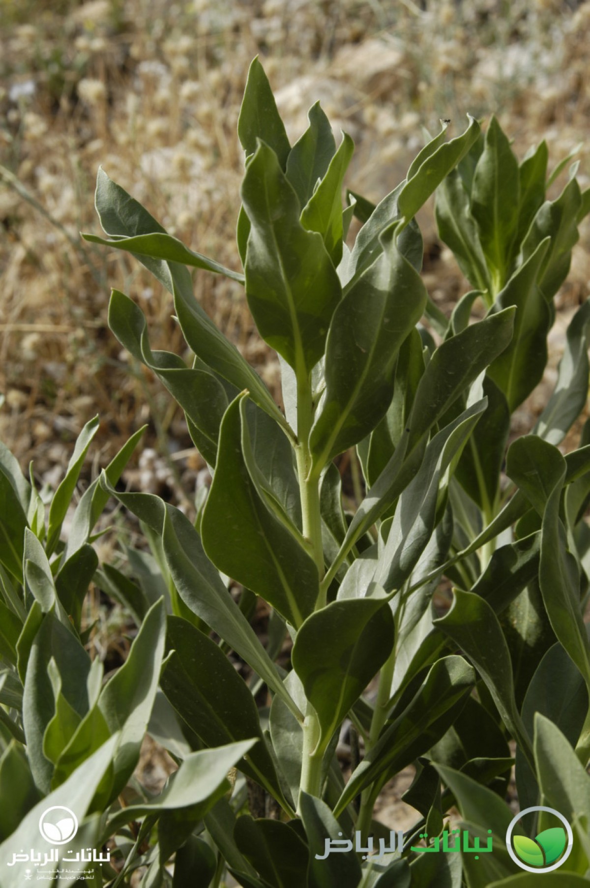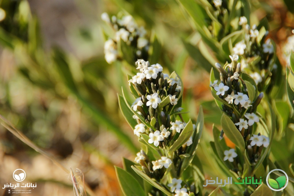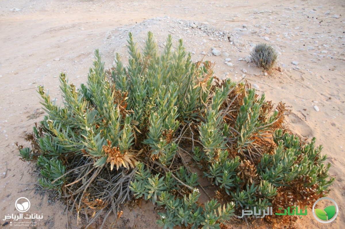 Rhazya stricta has the common Arabic name of harmel. It is an evergreen shrub growing about 1 metre high. This native shrub is distributed over the Arabian Peninsula. The numerous branches lie close to the ground. The leaves are alternately arranged, lanceolate and about 10 cm long. The foliage is very dense and leathery. The plant is a member of the Apocynaceae, and is poisonous in all parts. But, it was used as remedy for sore throat and fever. The small, white, star-like flowers appear in summer. After flowering, the plant develops small pods with black seeds. Propagation is by seed. The plant is very well adapted to harsh desert conditions with its strong foliage, tap roots and high salt tolerance. It grows on sandy or silty soil. Rhazya stricta can frequently be found in Arriyadh and its surroundings. With its dark-green foliage, it is eye-catching and a welcome sight in the harsh sunlight of the desert landscape. After long droughts, it may look a little straggly, because some evergreen leaves will dry out and become brown. Even so, however, it can be recommended for use in landscape design in open situations as a coloniser, a bank and slope stabiliser and for environmental consolidation. It is valuable to restore natural plant cover. In inner-city locations with some irrigation, it will not dry out, and the foliage will remain green. Some pruning will be necessary. It can be considered for natural themes or in situations where other plants are struggling because of hard site conditions, e.g. roadside greening.