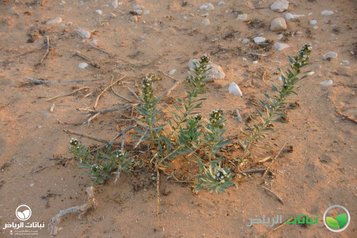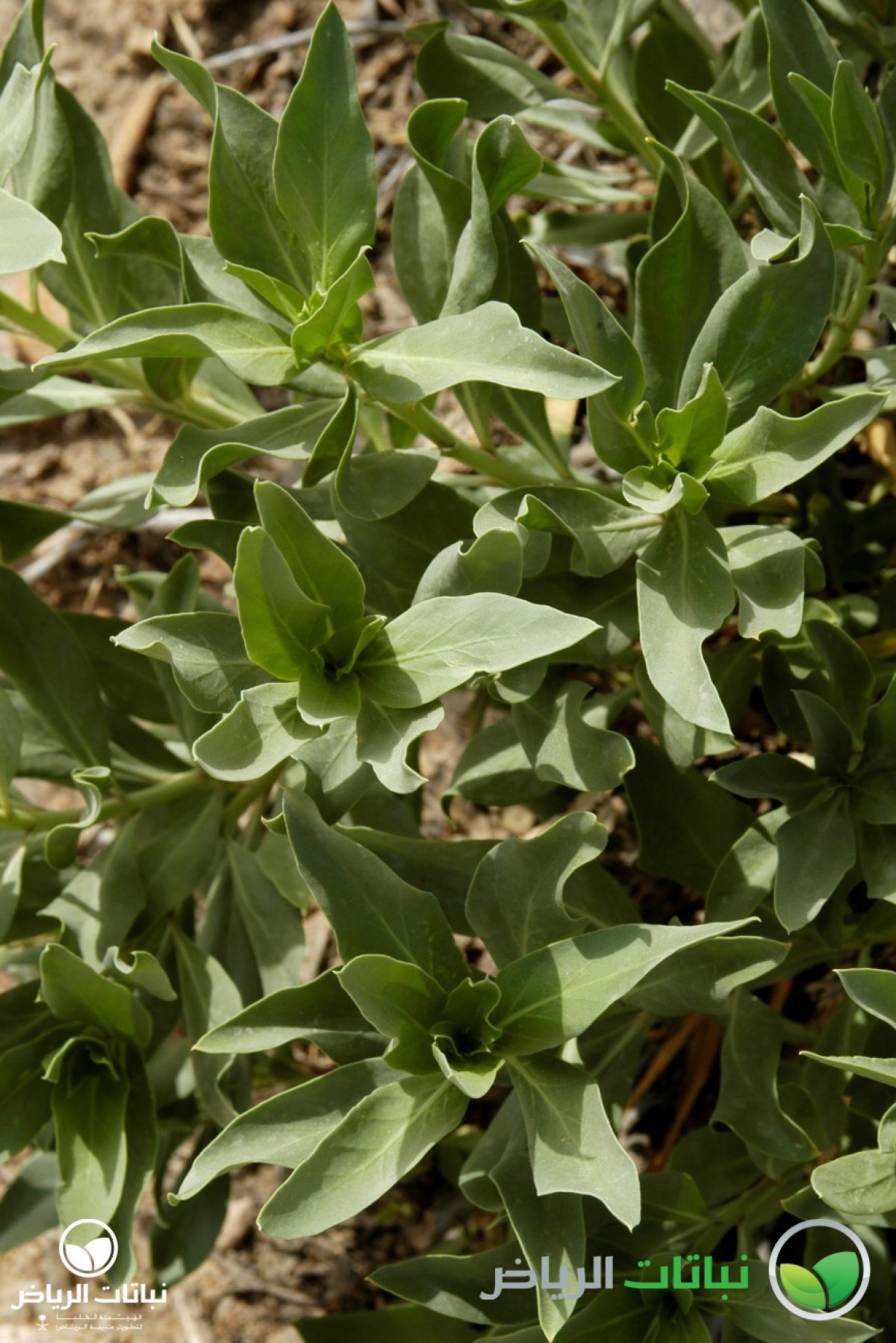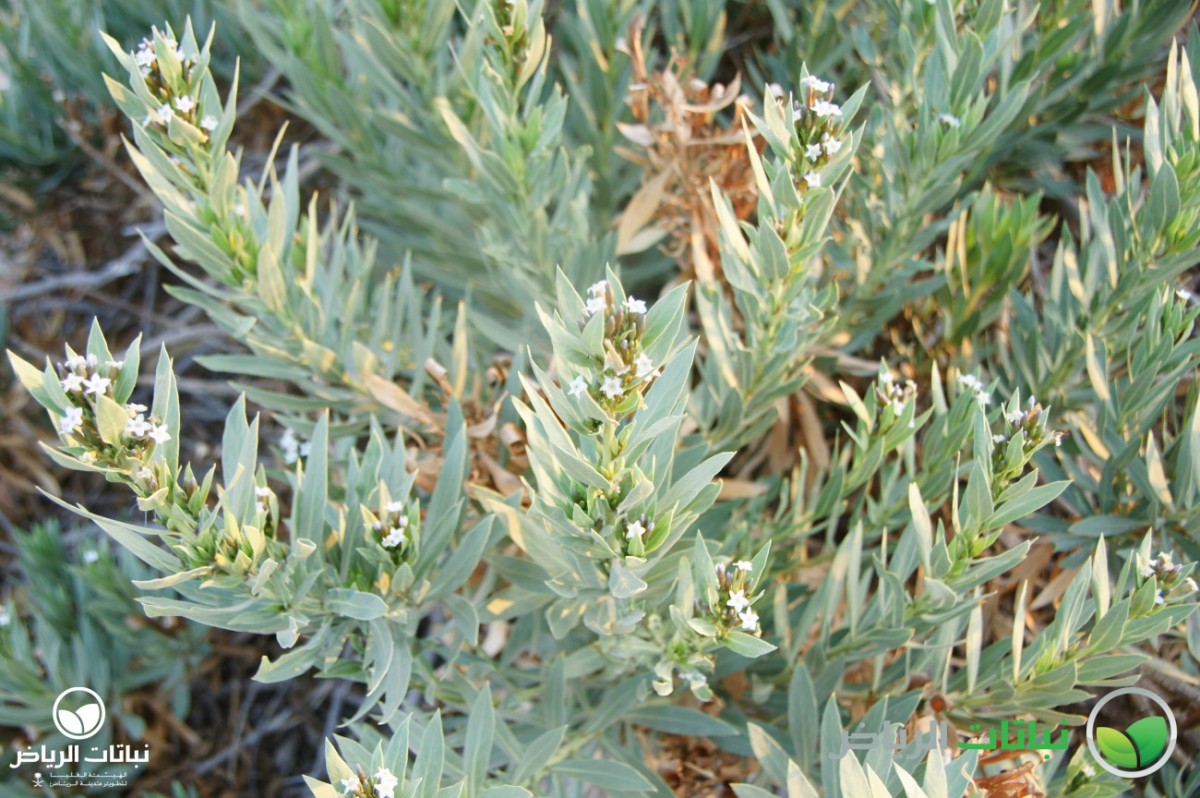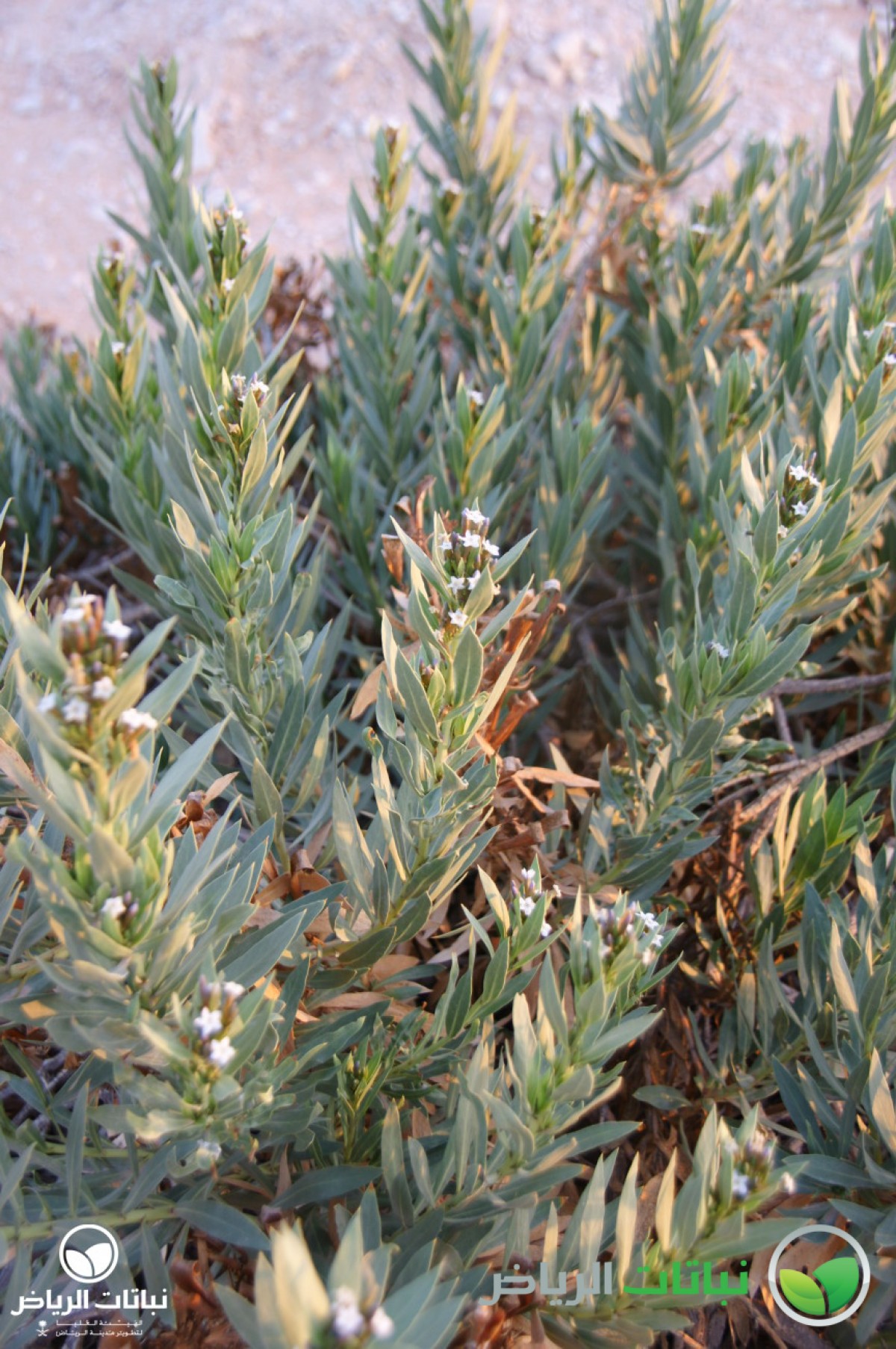 Rhazya stricta has the common Arabic name of harmel. It is an evergreen shrub growing about 1 metre high. This native shrub is distributed over the Arabian Peninsula. The numerous branches lie close to the ground. The leaves are alternately arranged, lanceolate and about 10 cm long. The foliage is very dense and leathery. The plant is a member of the Apocynaceae, and is poisonous in all parts. But, it was used as remedy for sore throat and fever. The small, white, star-like flowers appear in summer. After flowering, the plant develops small pods with black seeds. Propagation is by seed. The plant is very well adapted to harsh desert conditions with its strong foliage, tap roots and high salt tolerance. It grows on sandy or silty soil. Rhazya stricta can frequently be found in Arriyadh and its surroundings. With its dark-green foliage, it is eye-catching and a welcome sight in the harsh sunlight of the desert landscape. After long droughts, it may look a little straggly, because some evergreen leaves will dry out and become brown. Even so, however, it can be recommended for use in landscape design in open situations as a coloniser, a bank and slope stabiliser and for environmental consolidation. It is valuable to restore natural plant cover. In inner-city locations with some irrigation, it will not dry out, and the foliage will remain green. Some pruning will be necessary. It can be considered for natural themes or in situations where other plants are struggling because of hard site conditions, e.g. roadside greening.