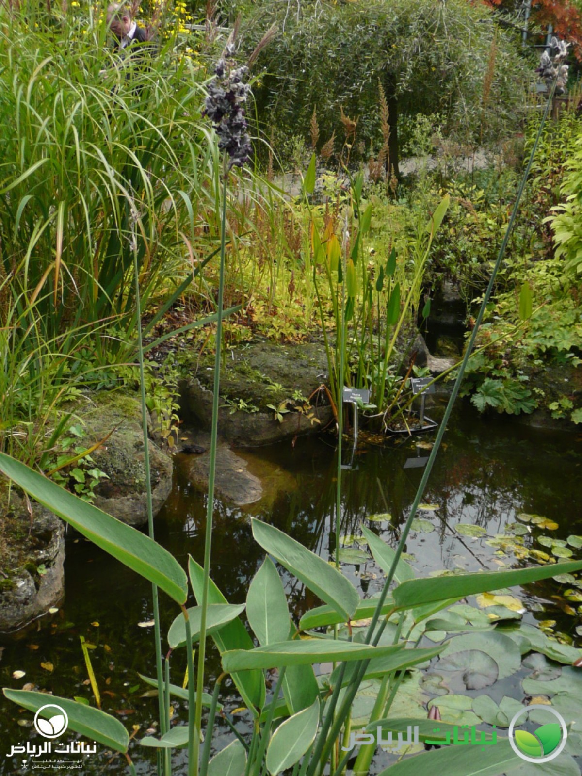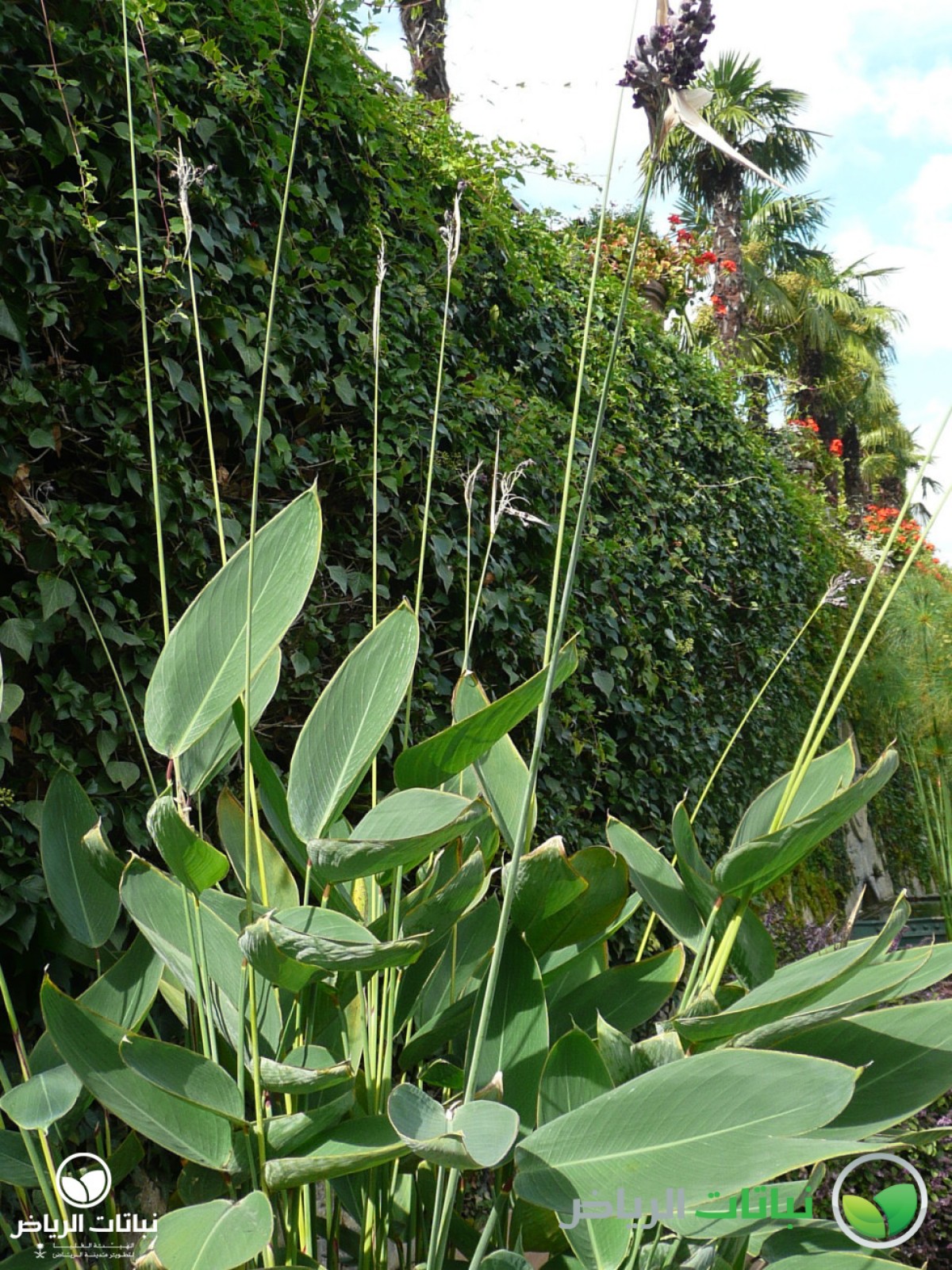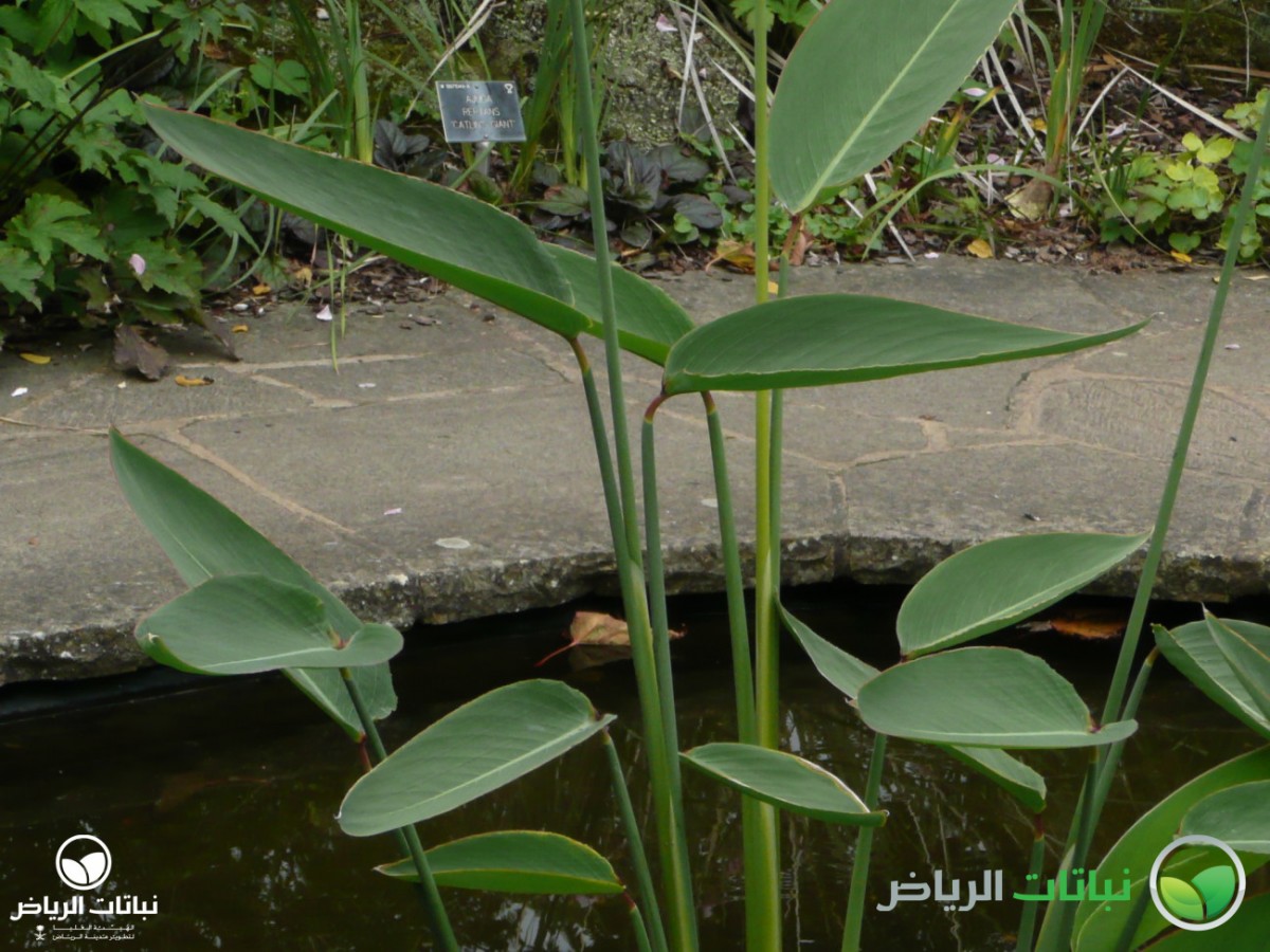 Native to tropical America, the Water Canna or Alligator Flag is a perennial, aquatic plant for shallow water or the margins of ponds and lakes. An emergent, broad-leaved plant with rosettes of leaves on narrow stems, T. dealbata can reach a height of 2 metres. The large, long-petioled leaves, as wide as 45 cm, are alternate and sheathed with broad, lance-shaped, and veined leaf blades. The bold, dramatic foliage is reminiscent of Bird of Paradise leaves. The lavender-purple flowers are gracefully borne on open, bracteate, dangling clusters on very long, thin stems throughout the summer. All parts of the plant are covered with a white, powdery coating. A further species, Thalia geniculata, is slightly smaller, and has characteristic red stems at the base. The Water Canna is best in full sun; in Arriyadh, a position in partial shade is better. Plants are not frost-hardy, so that the plant will die back in very cold weather, and re-emerge in the spring. Propagation is by seed or root division. Pests include aphids. A robust, tropical plant, its natural habitats are lakes, swamps, and rivers. T. dealbata is most commonly cultivated for large ponds or the edges of lakes. It will also look well in a large water jar. Maintenance and fertilising are necessary to keep the plant in good condition.