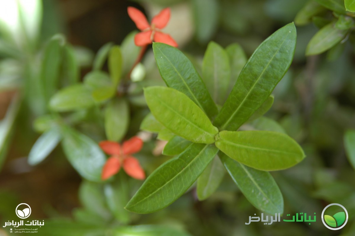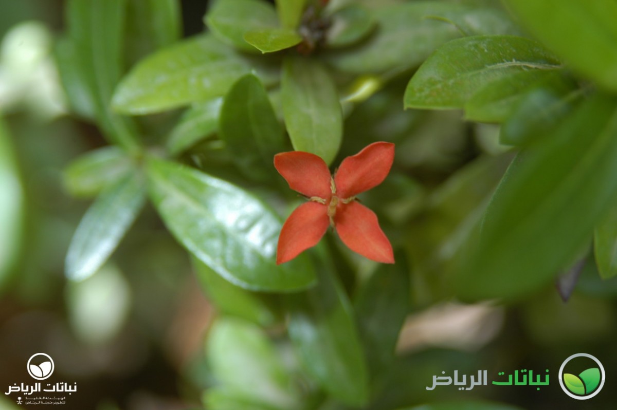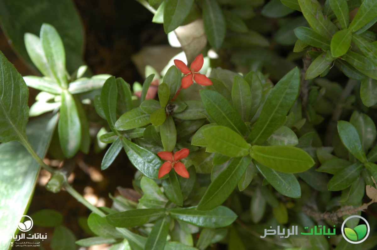 The Jungle Flame is an evergreen shrub native to India and Sri Lanka. Frost-sensitive in Arriyadh, it has become a popular garden shrub in recent years. Its shiny, leathery leaves measure 5 to 10 cm long and 3 to 5 cm across. Young foliage sprouts tinted in bronze. Bright red flowers appear in clusters of 10 cm diameter and attract butterflies. At first, the outer flowers open while the inner ones follow later on. Various cultivars are available with flower colours in pink, orange, yellow or white. Flowering begins in late spring, but flowers appear sporadically all year round. Other varieties grow compact and seem to be hybrids with the Flame of the Woods (Ixora chinensis). It is less suitable for desert climates than its Chinese cousin, but takes more shade. In its native environment, this shrub reaches a height of 6 metres, but in Arriyadh it grows to only about half that size. Softwood cuttings root best at the end of summer, encouraged by some rooting hormone. Initially, they should be pinched to achieve regular branching. If grown in pots, the Jungle Flame tends to shed flowers, especially if it is moved. It appreciates light, but does not tolerate full sun if this is associated with harsh conditions such as drought and wind. The soil should be well drained, acidic and nutrient-rich with plenty of compost. Frequent deep irrigation is essential to establish the plants. The plants look great if planted in groups or as a flowering hedge. Scale sometimes affects this shrub, but otherwise it tends to be disease-free.